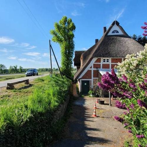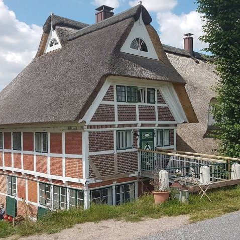 Unser Bauernhaus schmiegt sich direkt an den Deich und hat damit etwas ganz Besonderes. Auf dem Deich blickt man über Elbwiesen, Felder und Wälder und fühlt sich gerne auch mal leicht an Kanada oder Alaska erinnert. In die Wohnungen gelangt man über eine Deichbrücke, die direkt in das erste Geschoss des Hauses führt. Das ist so einmalig in Hamburg.