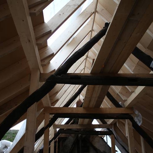 Es geht voran. Unser neuer Dachstuhl wurde mittlerweile auf den alten Dachstuhl aufgebaut. Da das Haus an der Gartenseite ca. 40 cm abgesackt ist (in 300 Jahren) und wir im Obergeschoss eine gerade Decke haben wollten, musste deshalb der First ein wenig erhöht werden. Zwei schöne, ortstypische Gauben für viel Licht haben wir nun auch.…